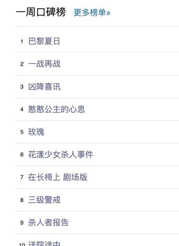 大概呢,就是这样。 感兴趣的朋友,还是可以去找来其中的影片看看,也许,就会有惊喜呢。 最后,还是例行附上一周豆瓣口碑榜的完整榜单: